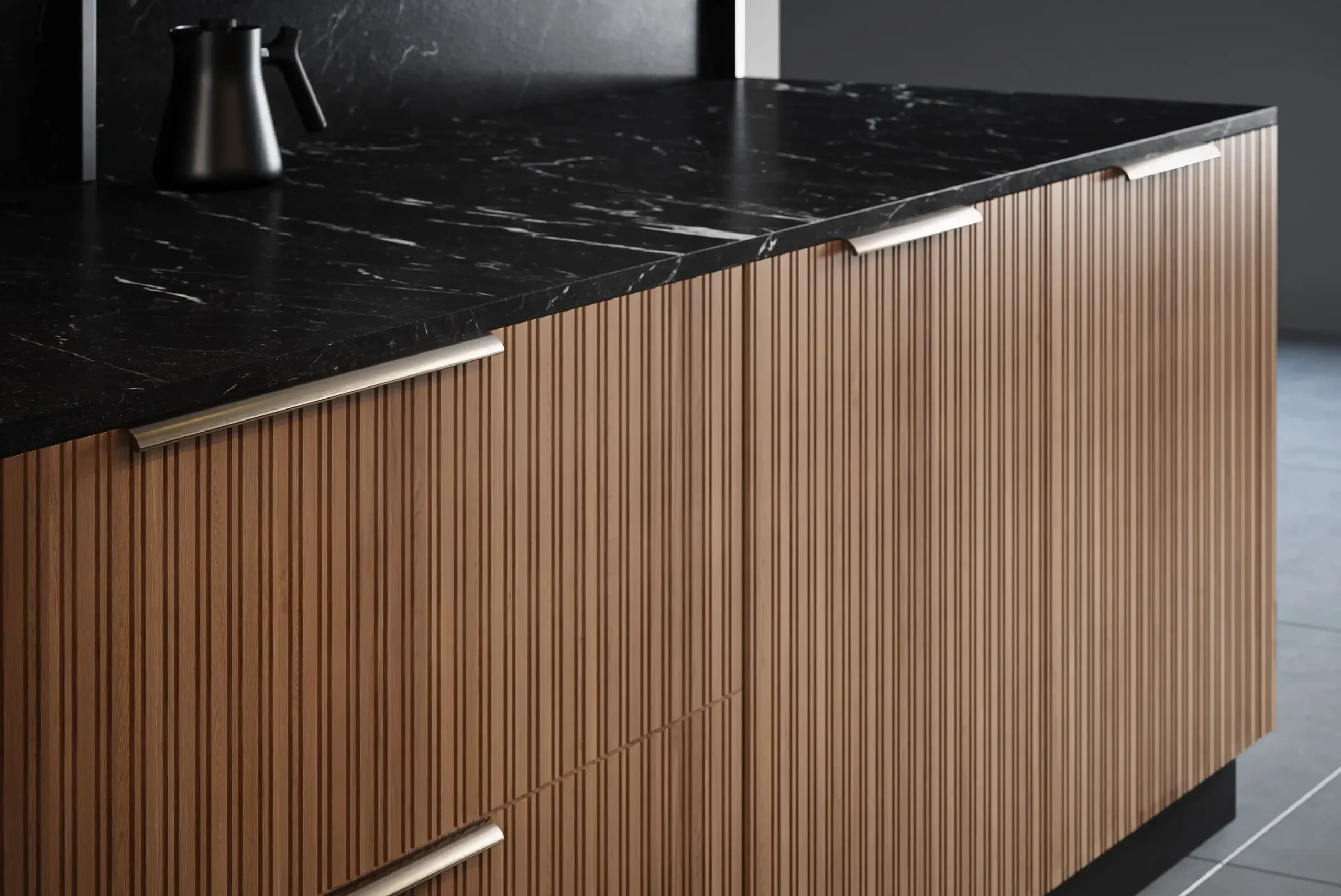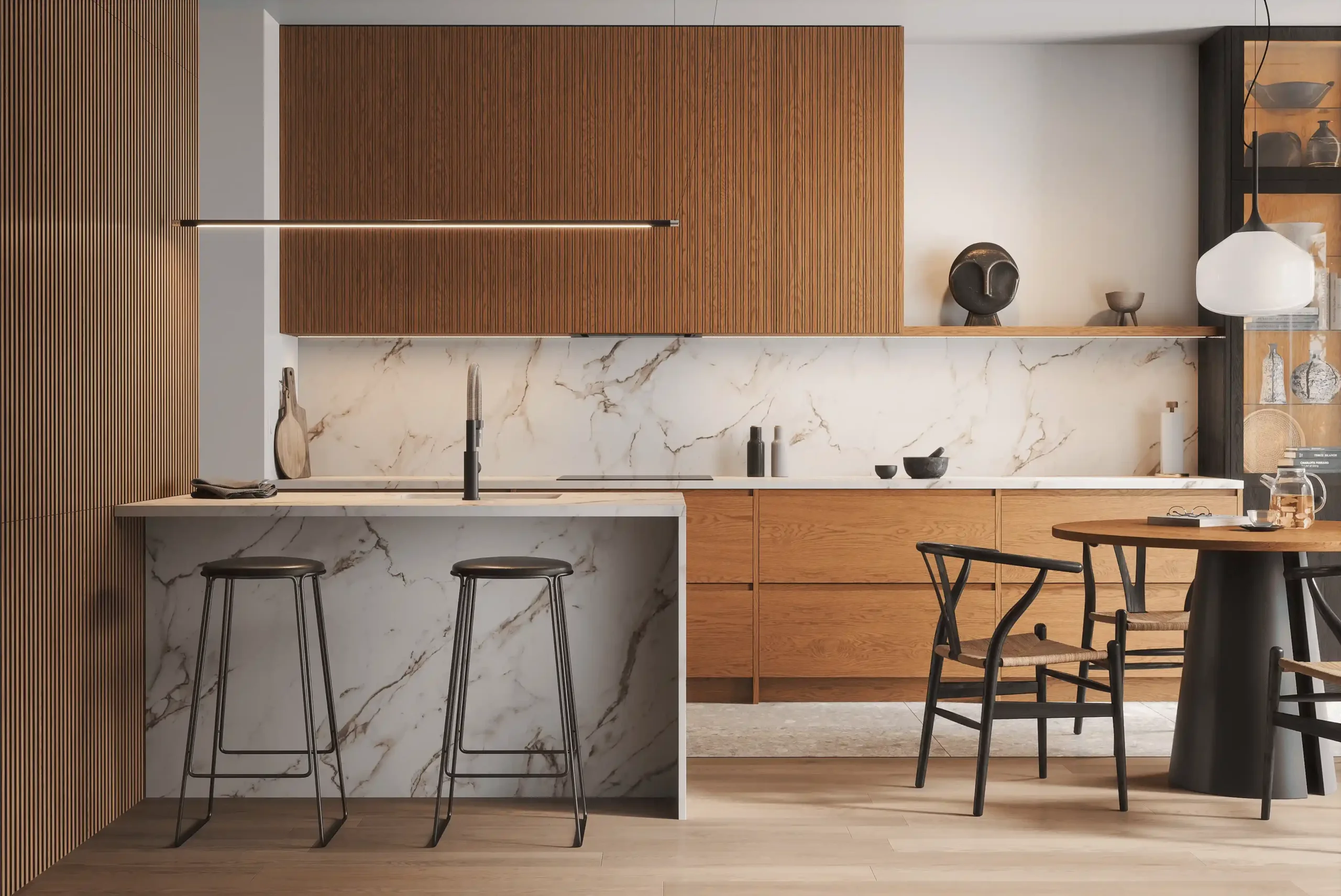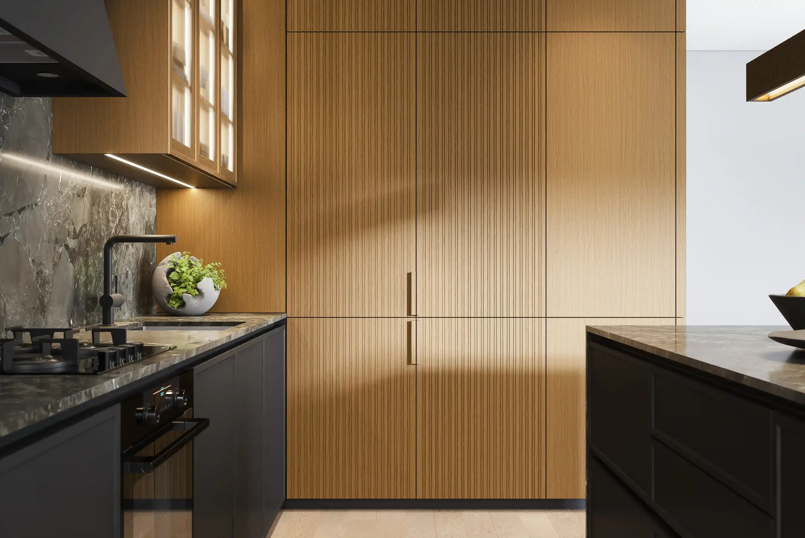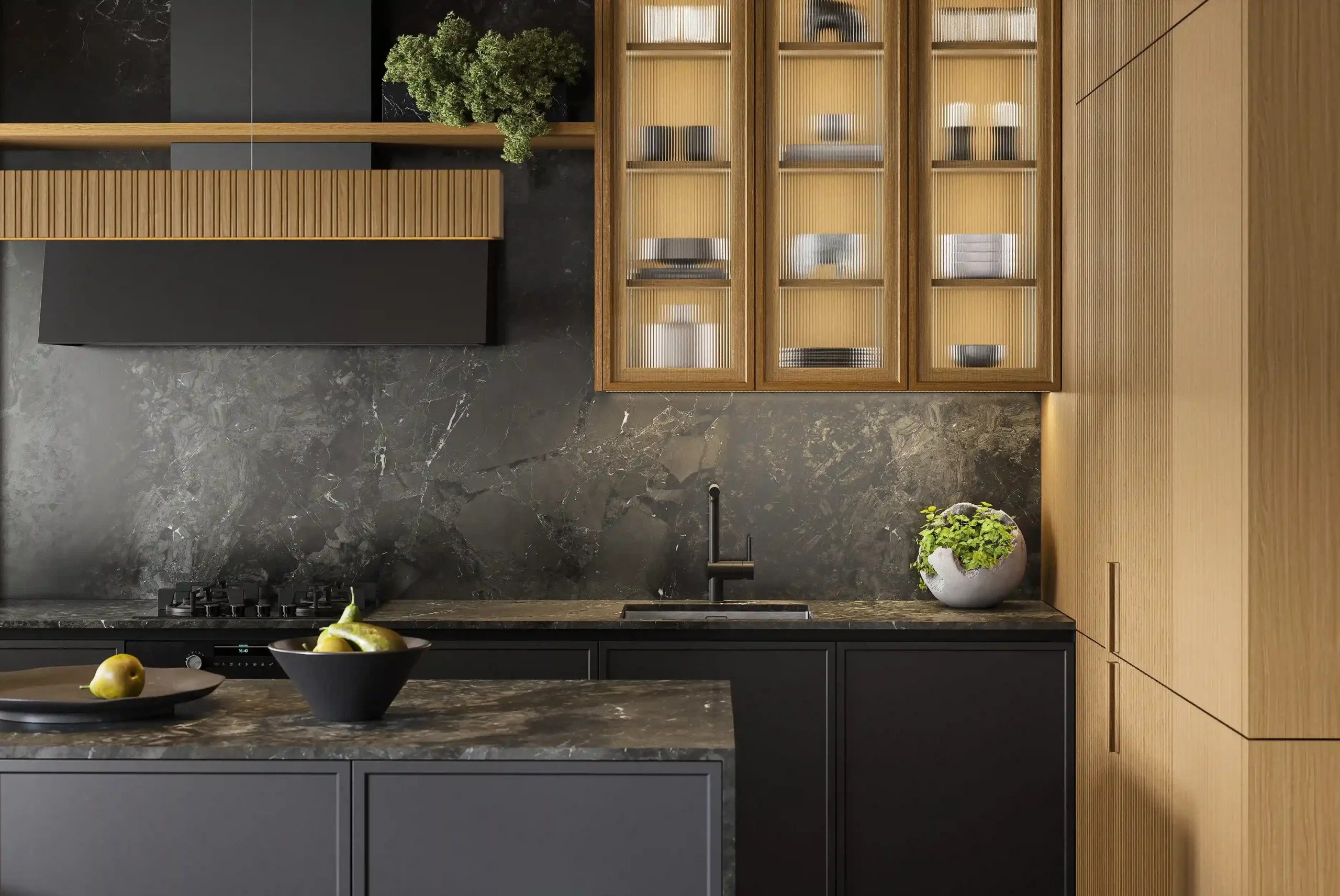 Котра является идеальным примером минимализма и грамотно организованного пространства в стиле джапанди. Модель сочетает в себе фасады из натурального дерева и роскошные столешницы из искусственного камня, а фрезерованные верхние модули создают атмосферу легкости. Подсветка в витрине-буфете добавляет дополнительную игру теней и света в вечернее время. Котра станет центром вашего дома, где каждая деталь подчеркивает высокое качество и чувство стиля. Создайте пространство, в котором удобно готовить и принимать гостей!