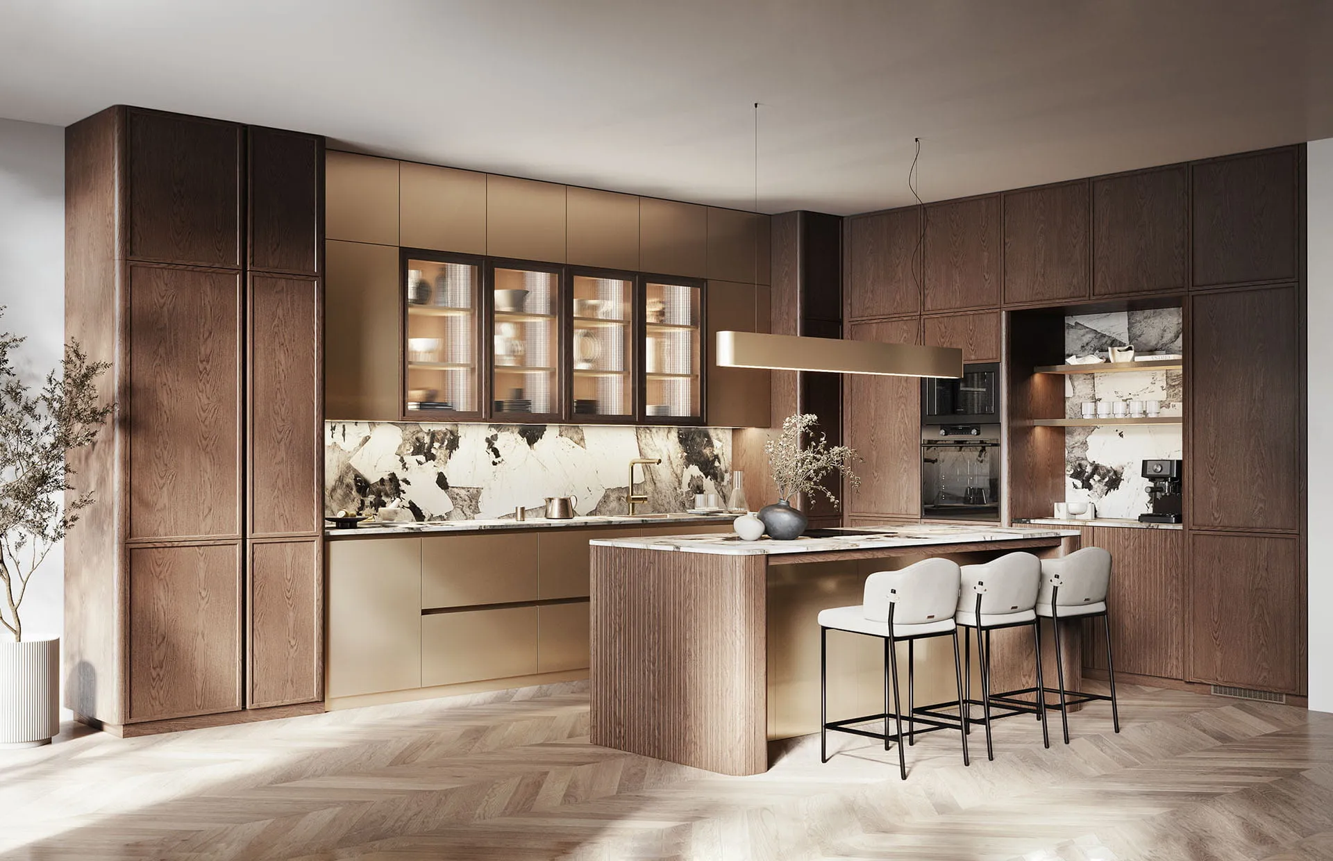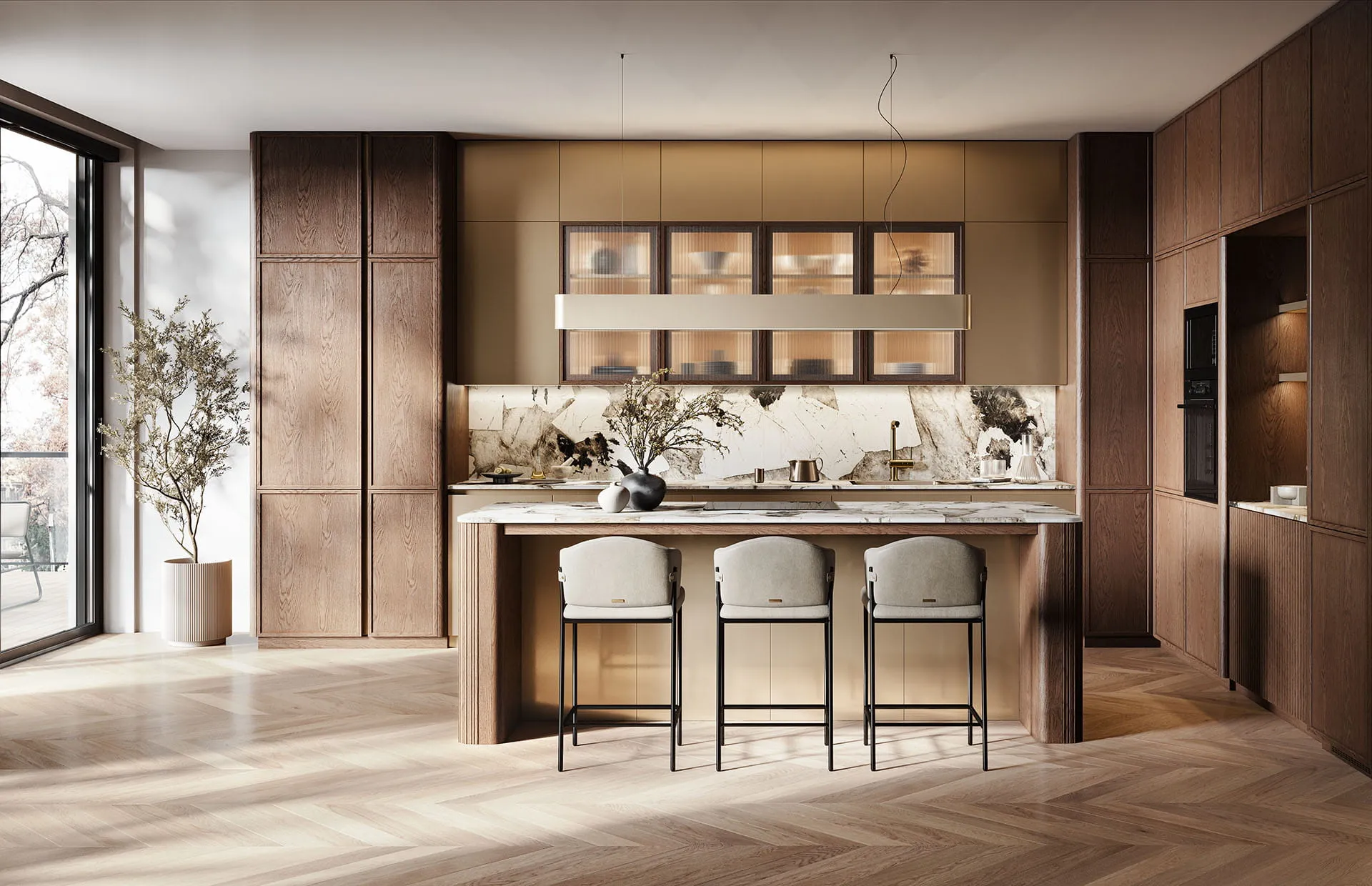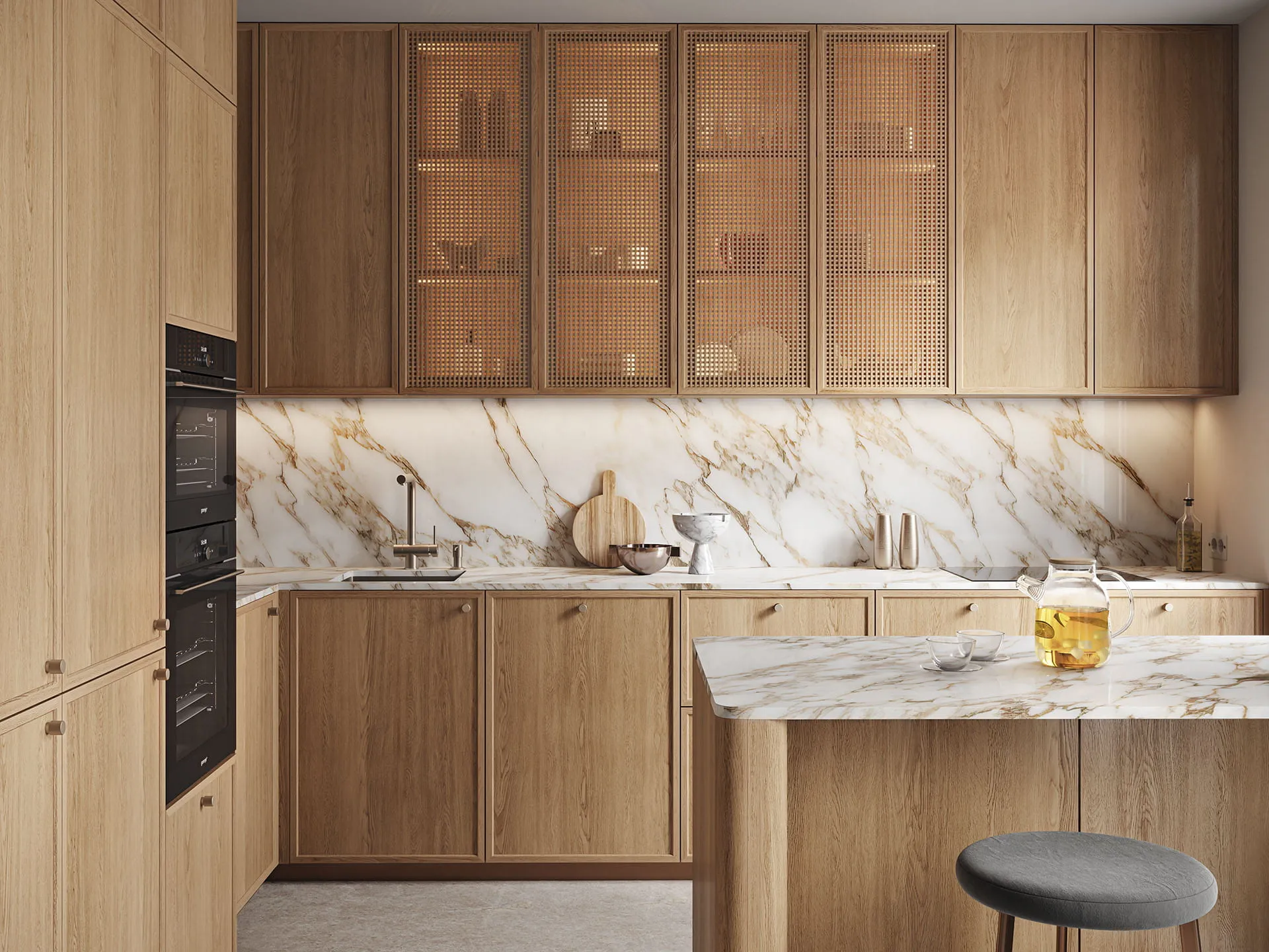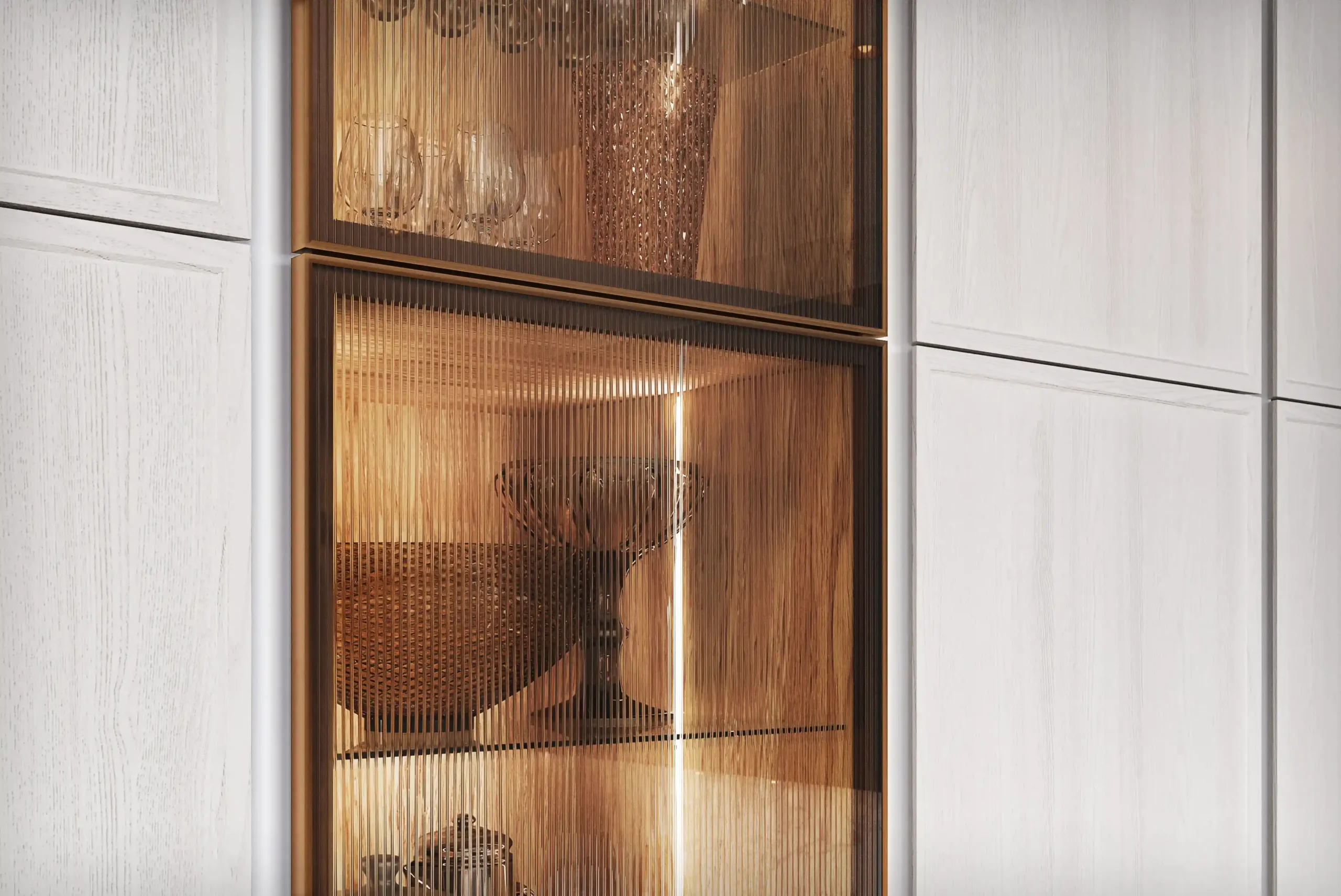 В модели Петра сочетаются разные фактуры и материалы, которые вместе создают шедевр в стиле джапанди. Прочные фрезерованные фасады песочных оттенков, выполненные из древесины ясеня или дуба придают кухне свой неповторимый шарм. Gola-профиль вместо традиционных накладных ручек, стеклянные шкафы-витрины, столешница и скинали из искусственного камня подчеркивают практичность и стиль. Откройте для себя пространство, вдохновляющее на кулинарные эксперименты и уютные семейные вечера!