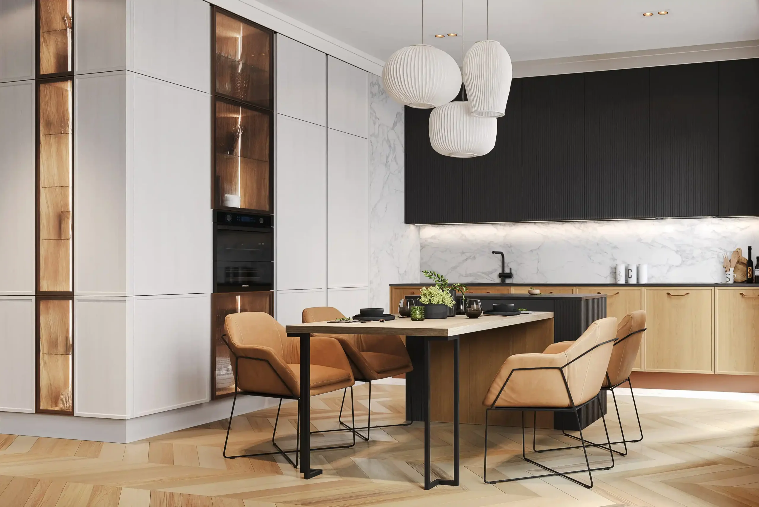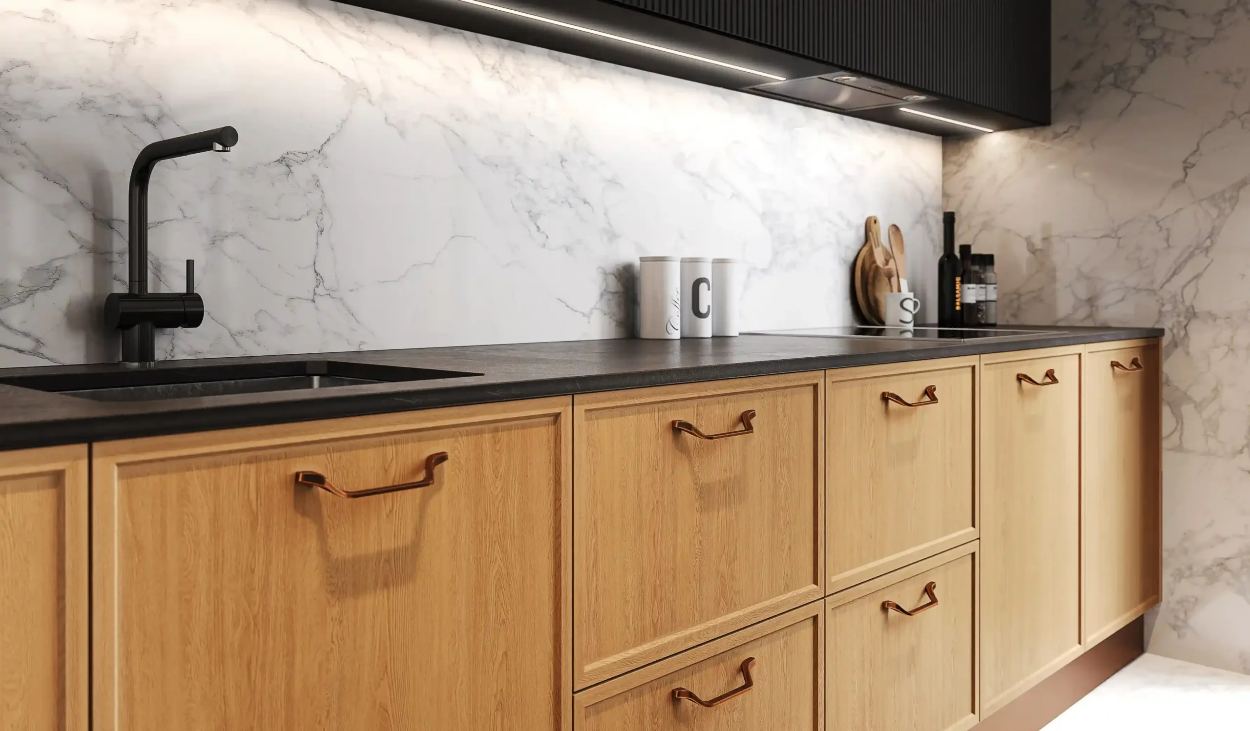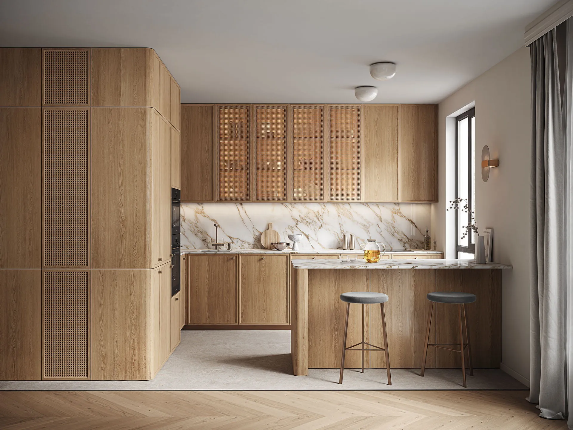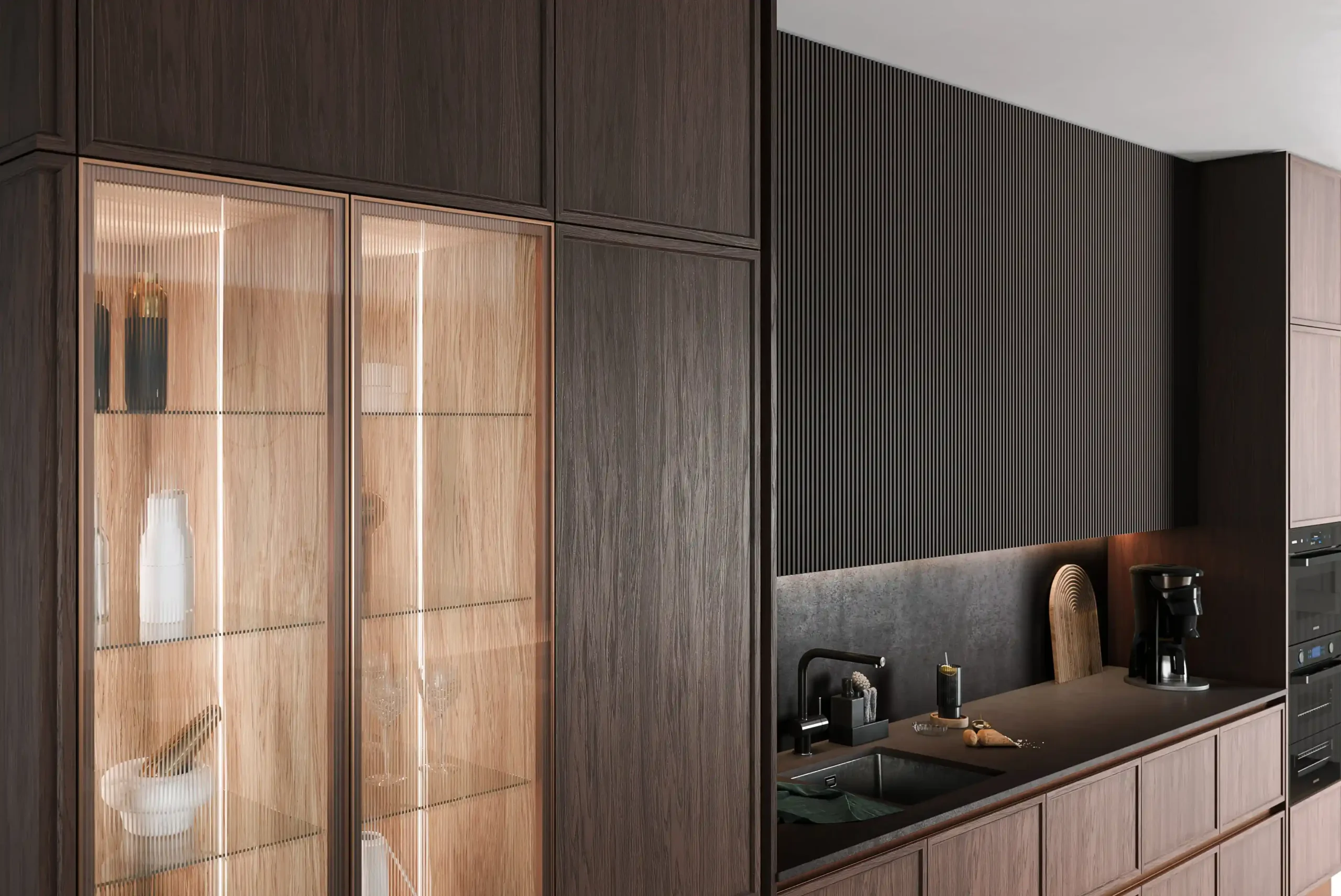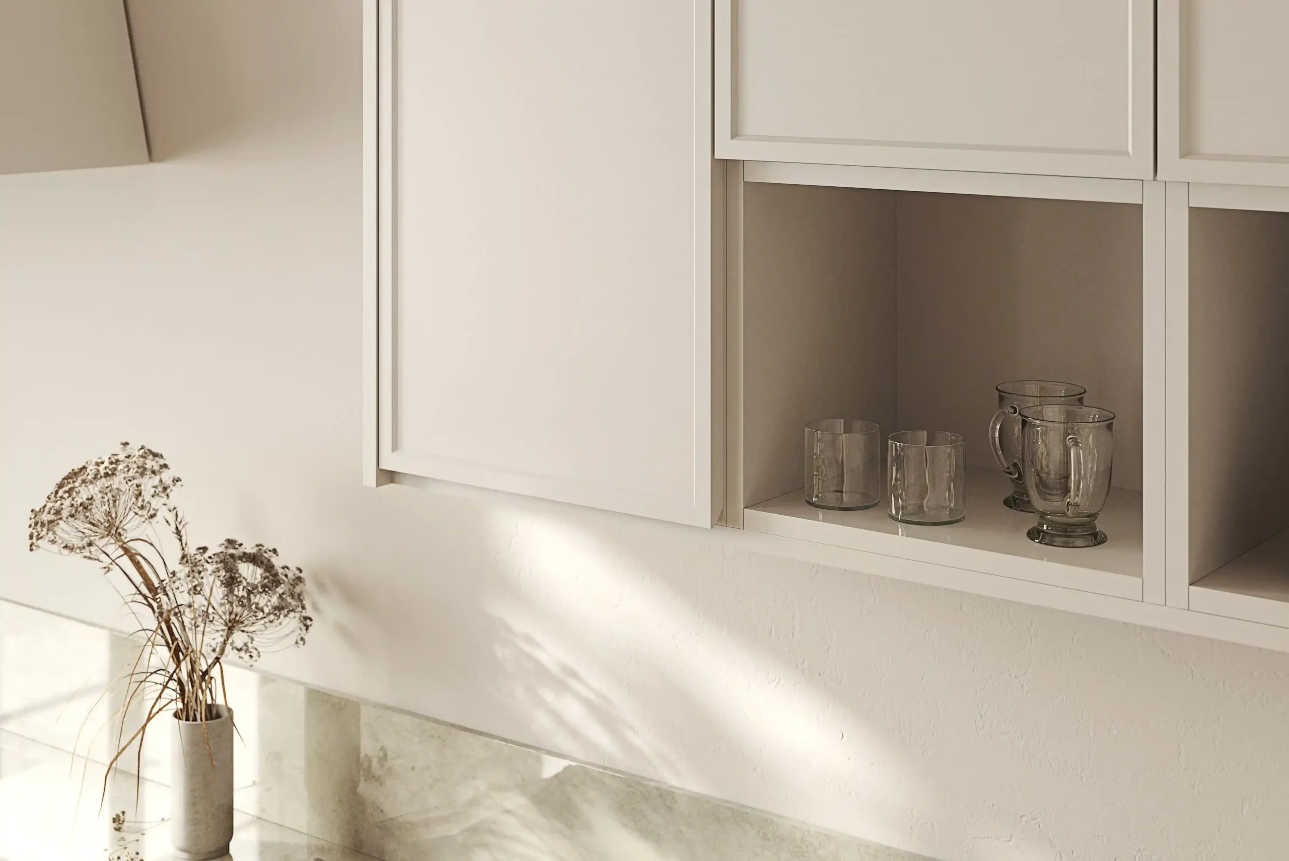 В модели Петра сочетаются разные фактуры и материалы, которые вместе создают шедевр в стиле джапанди. Прочные фрезерованные фасады песочных оттенков, выполненные из древесины ясеня или дуба придают кухне свой неповторимый шарм. Gola-профиль вместо традиционных накладных ручек, стеклянные шкафы-витрины, столешница и скинали из искусственного камня подчеркивают практичность и стиль. Откройте для себя пространство, вдохновляющее на кулинарные эксперименты и уютные семейные вечера!