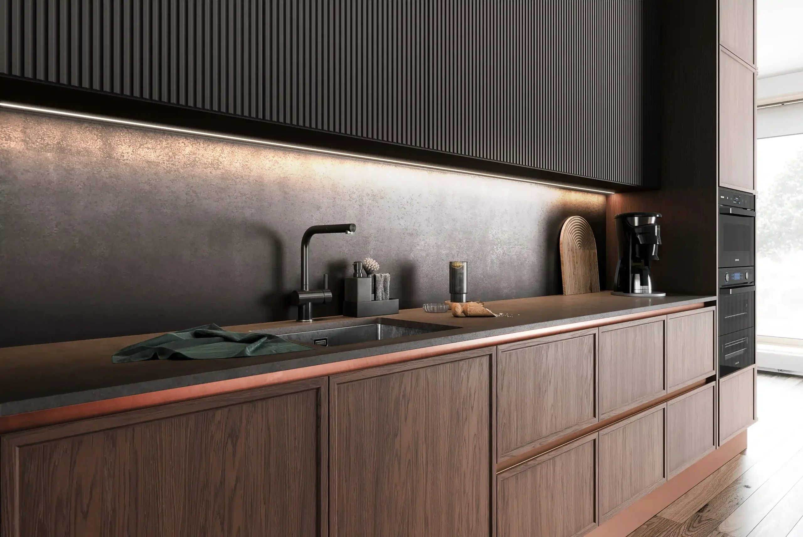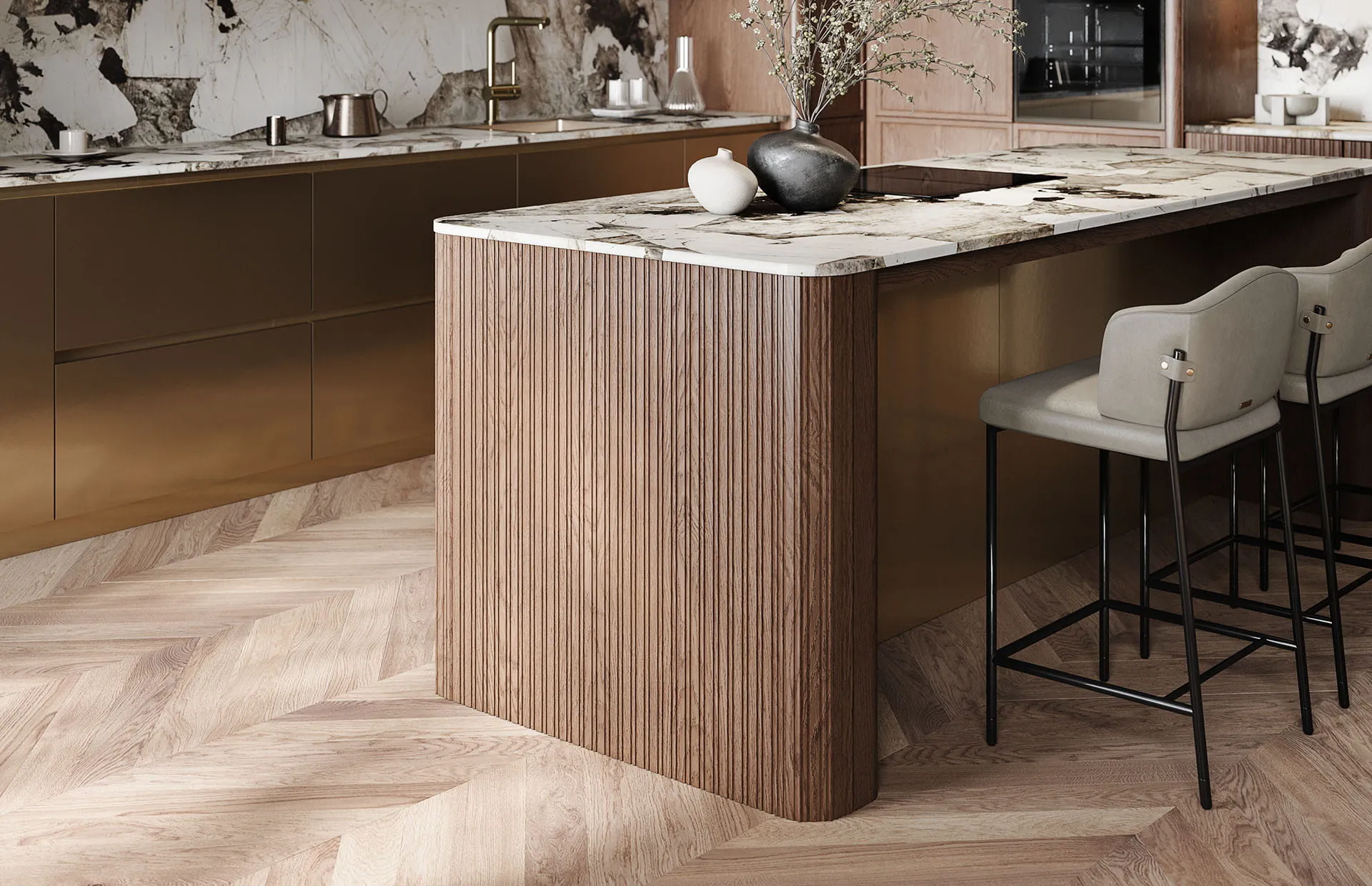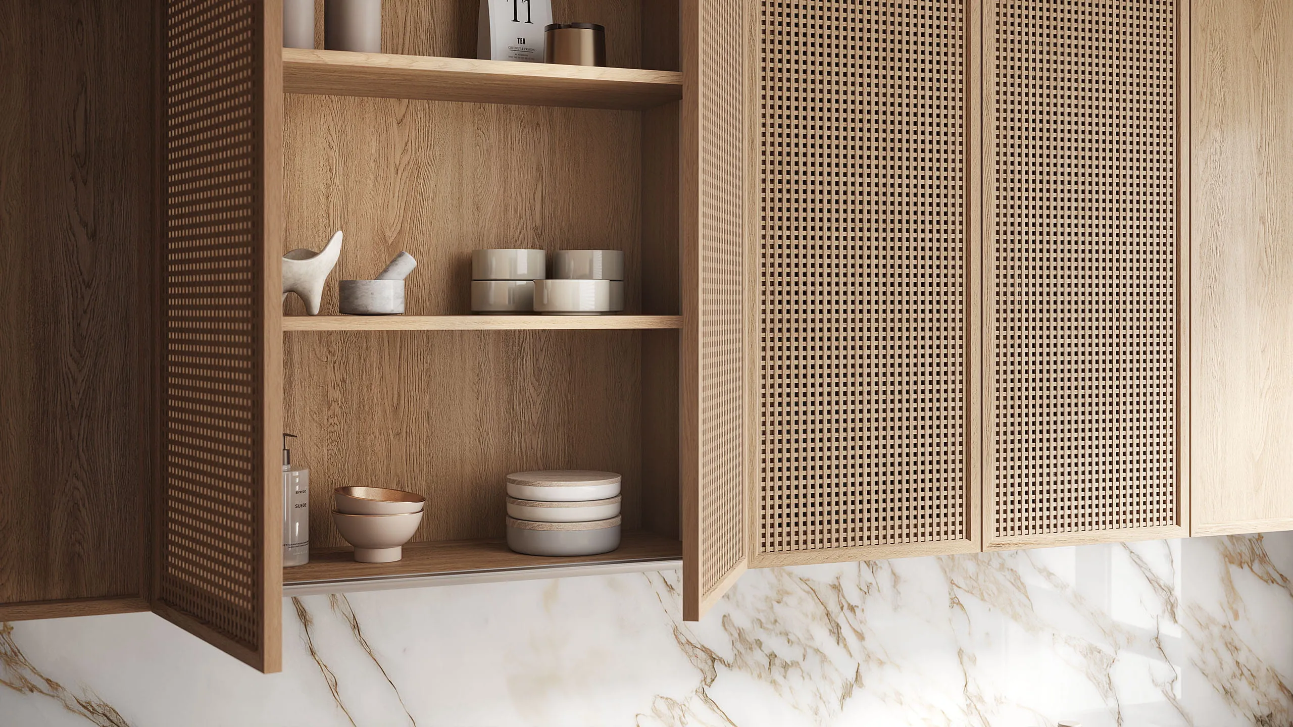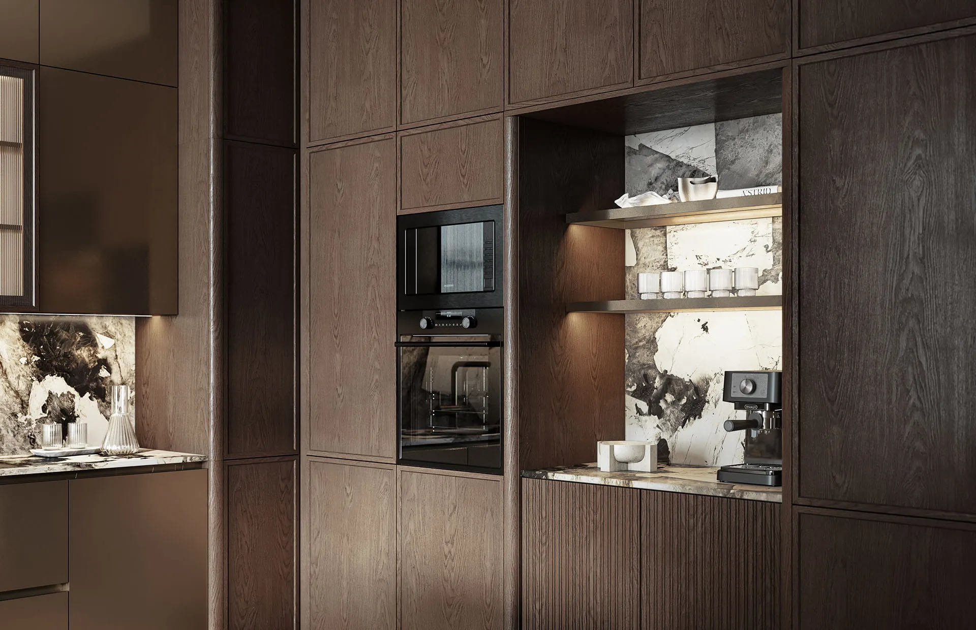 В модели Петра сочетаются разные фактуры и материалы, которые вместе создают шедевр в стиле джапанди. Прочные фрезерованные фасады песочных оттенков, выполненные из древесины ясеня или дуба придают кухне свой неповторимый шарм. Gola-профиль вместо традиционных накладных ручек, стеклянные шкафы-витрины, столешница и скинали из искусственного камня подчеркивают практичность и стиль. Откройте для себя пространство, вдохновляющее на кулинарные эксперименты и уютные семейные вечера!