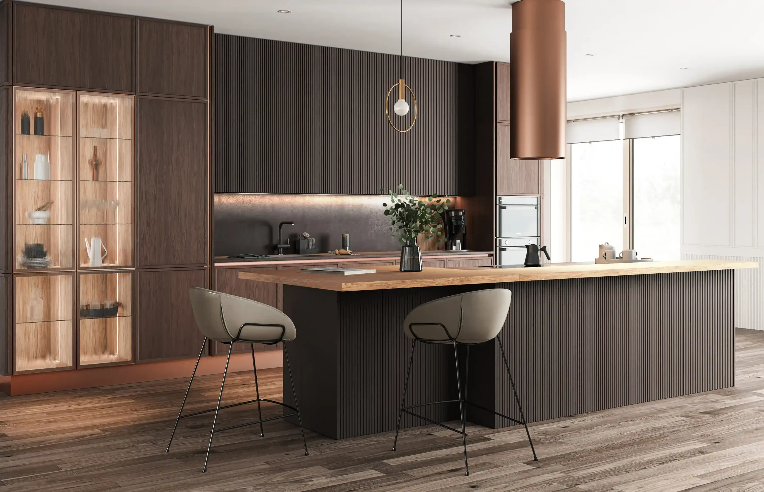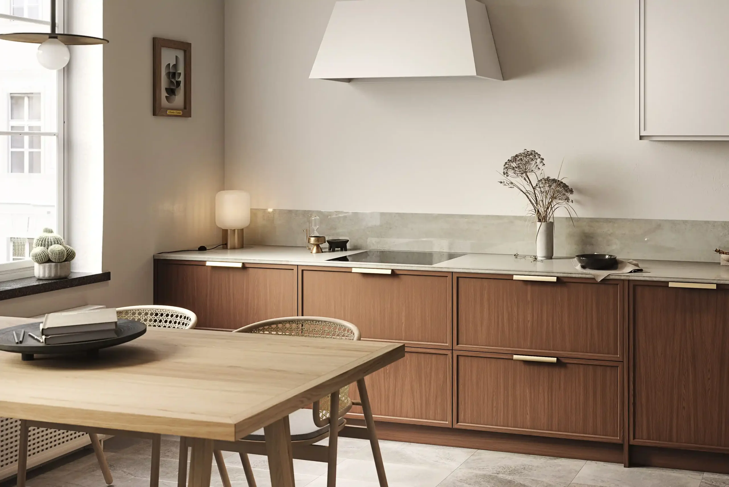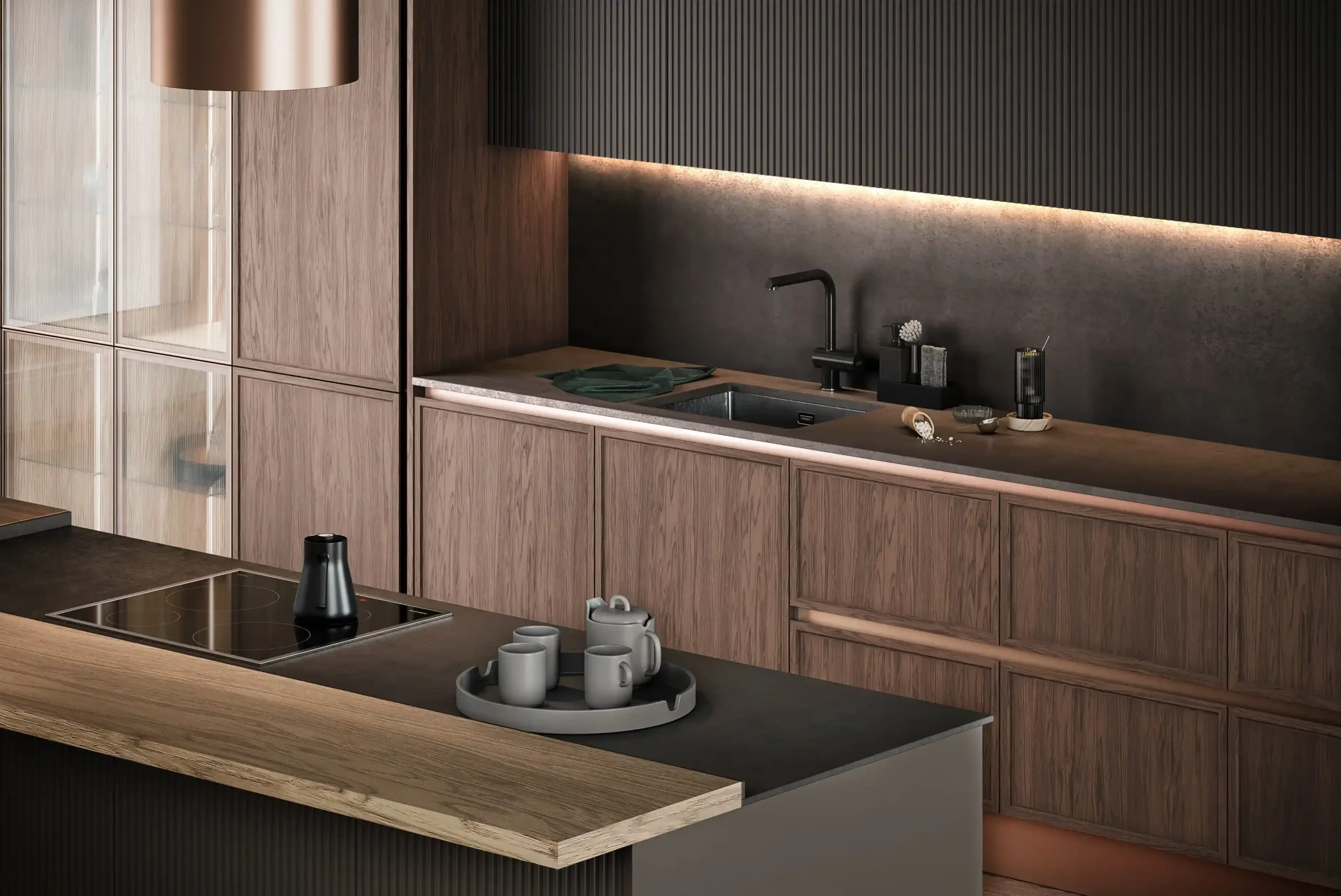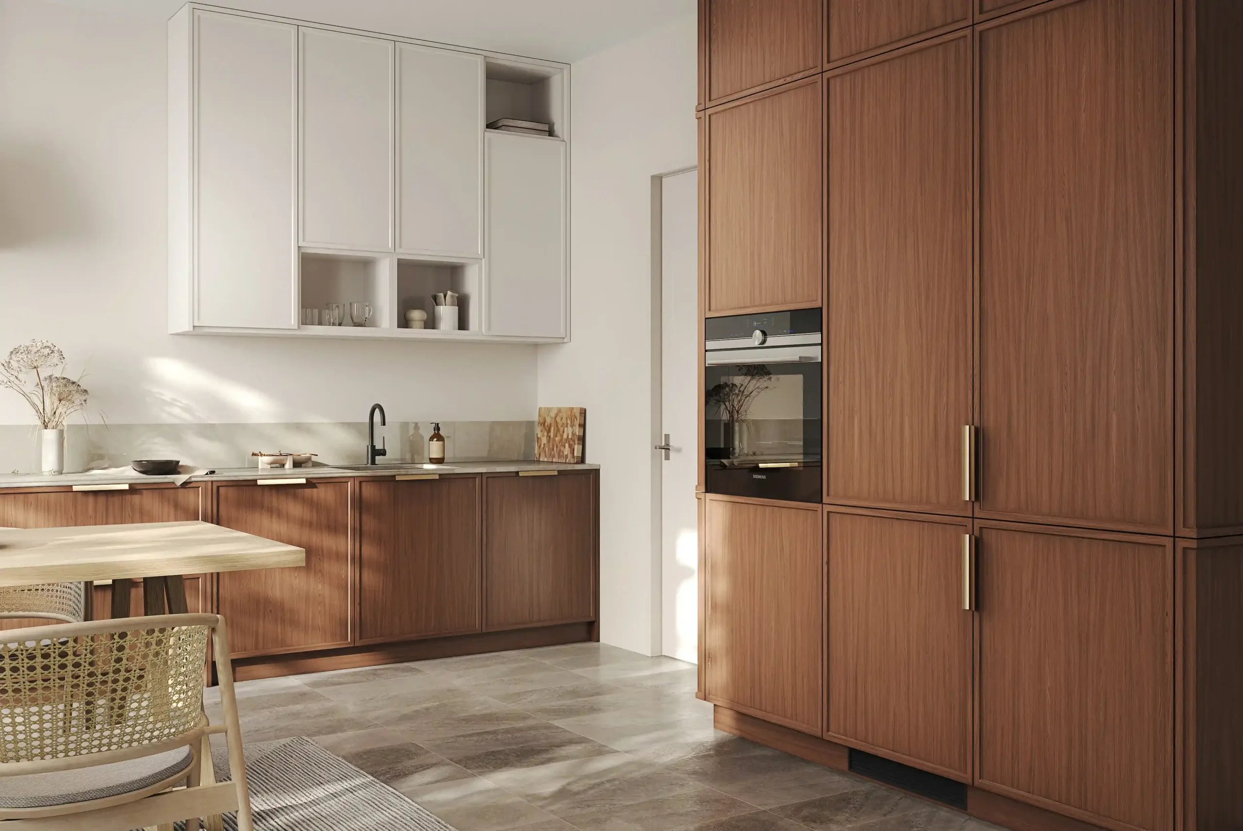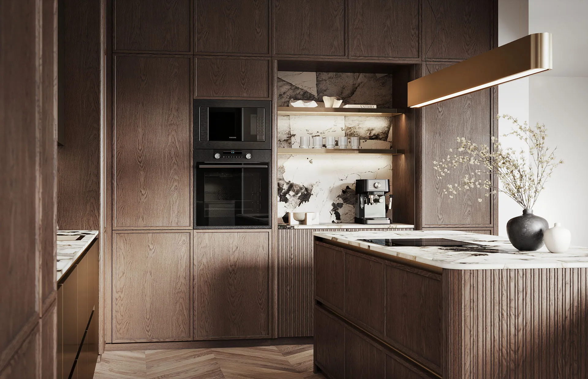 В модели Петра сочетаются разные фактуры и материалы, которые вместе создают шедевр в стиле джапанди. Прочные фрезерованные фасады песочных оттенков, выполненные из древесины ясеня или дуба придают кухне свой неповторимый шарм. Gola-профиль вместо традиционных накладных ручек, стеклянные шкафы-витрины, столешница и скинали из искусственного камня подчеркивают практичность и стиль. Откройте для себя пространство, вдохновляющее на кулинарные эксперименты и уютные семейные вечера!