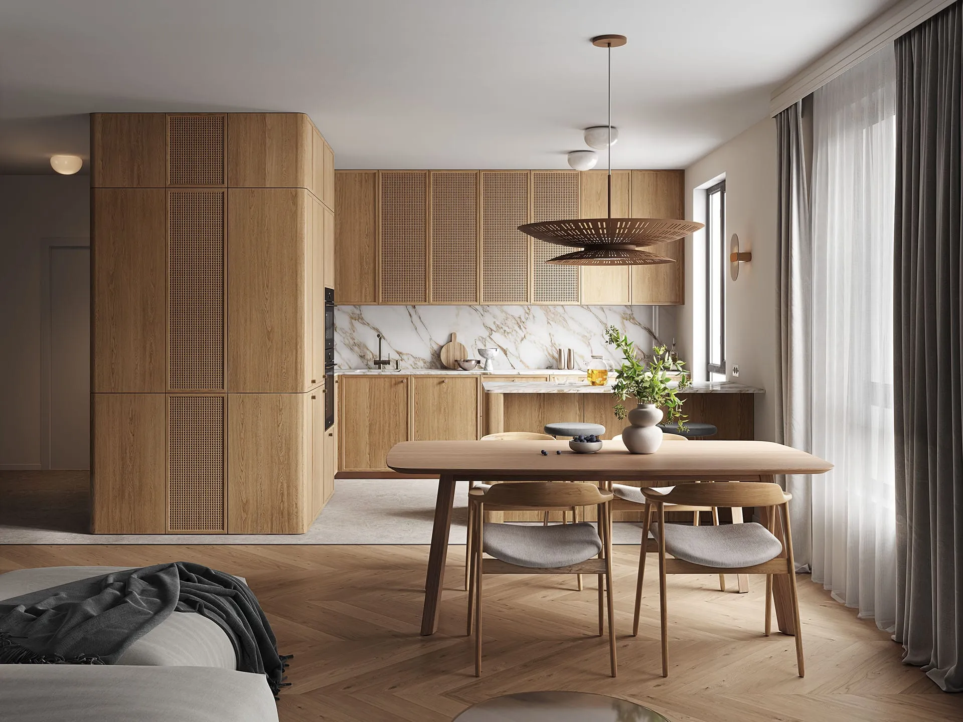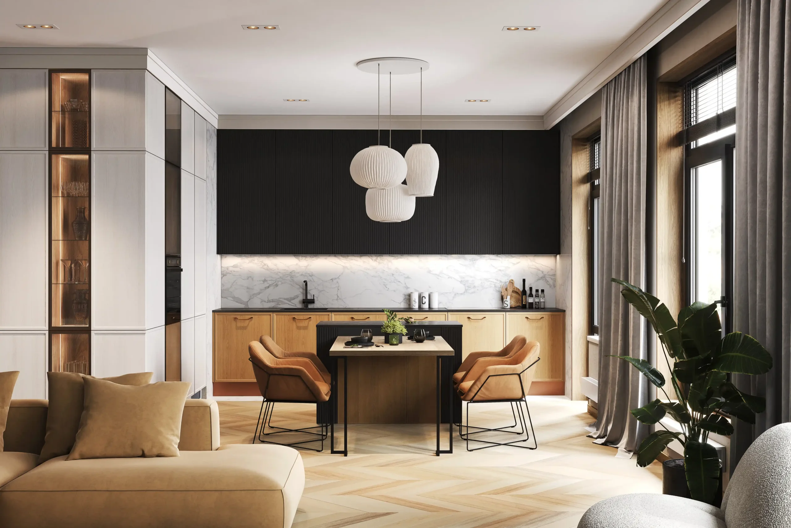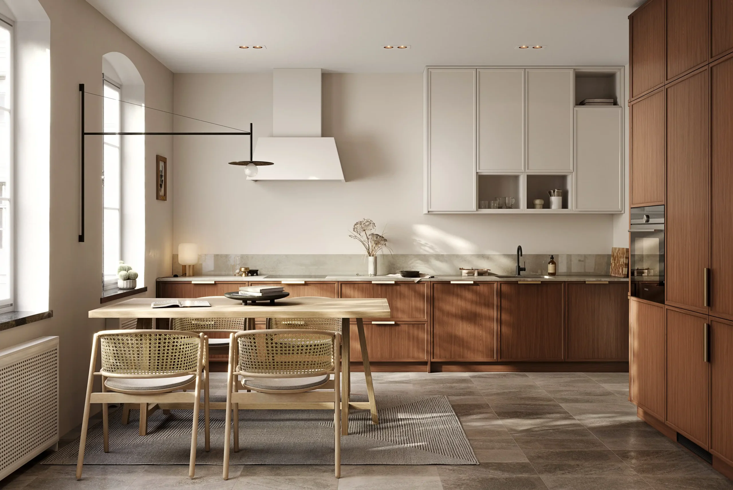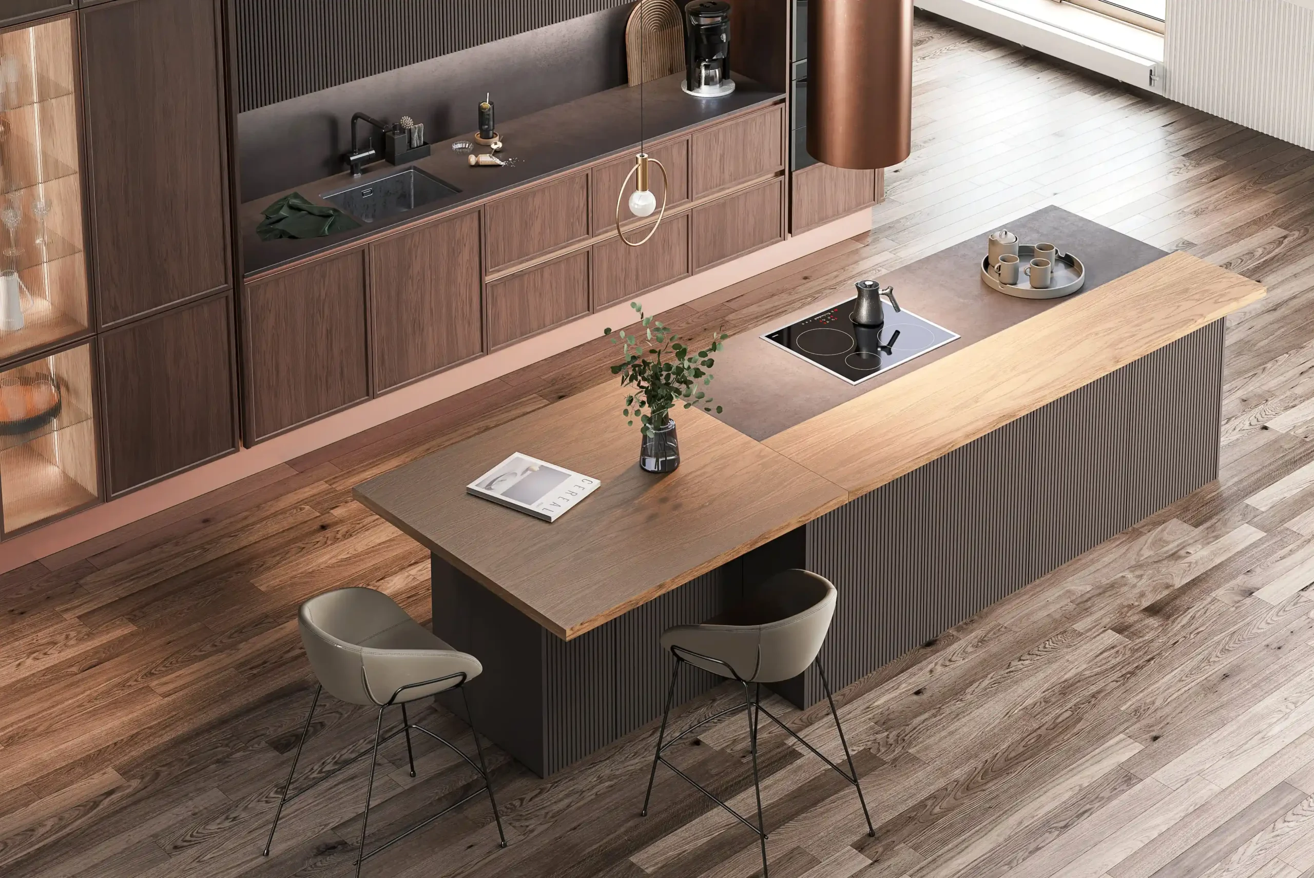 В модели Петра сочетаются разные фактуры и материалы, которые вместе создают шедевр в стиле джапанди. Прочные фрезерованные фасады песочных оттенков, выполненные из древесины ясеня или дуба придают кухне свой неповторимый шарм. Gola-профиль вместо традиционных накладных ручек, стеклянные шкафы-витрины, столешница и скинали из искусственного камня подчеркивают практичность и стиль. Откройте для себя пространство, вдохновляющее на кулинарные эксперименты и уютные семейные вечера!