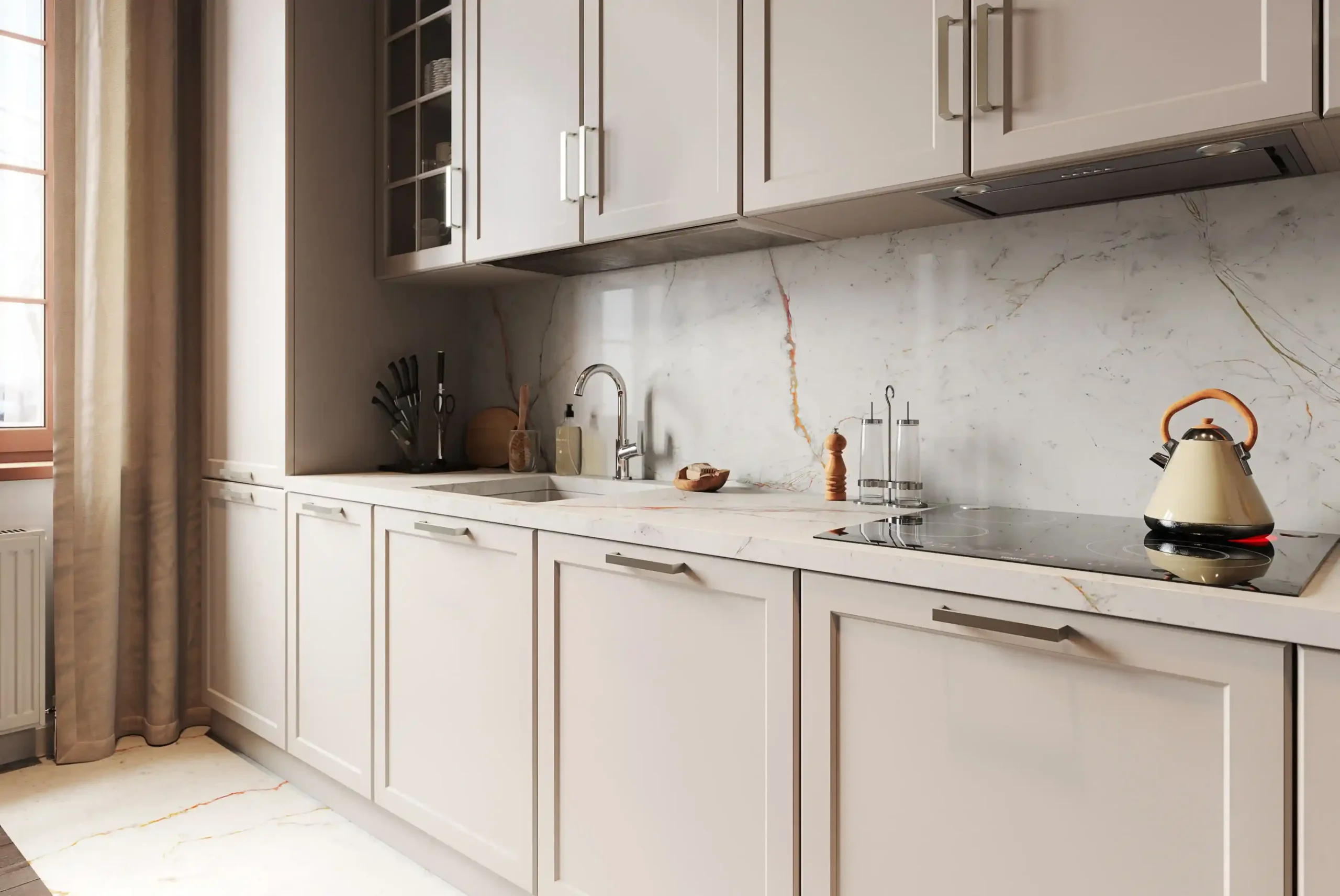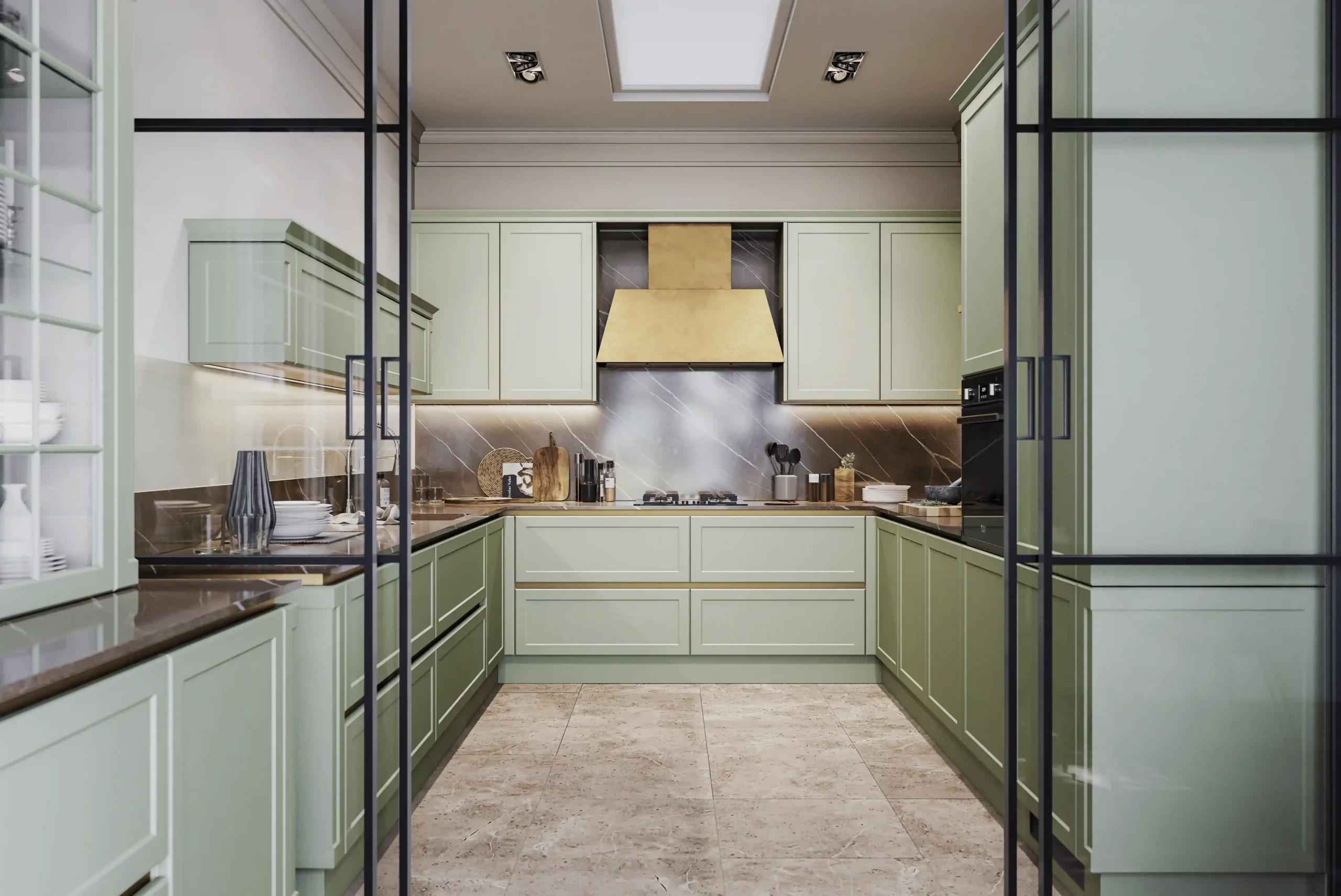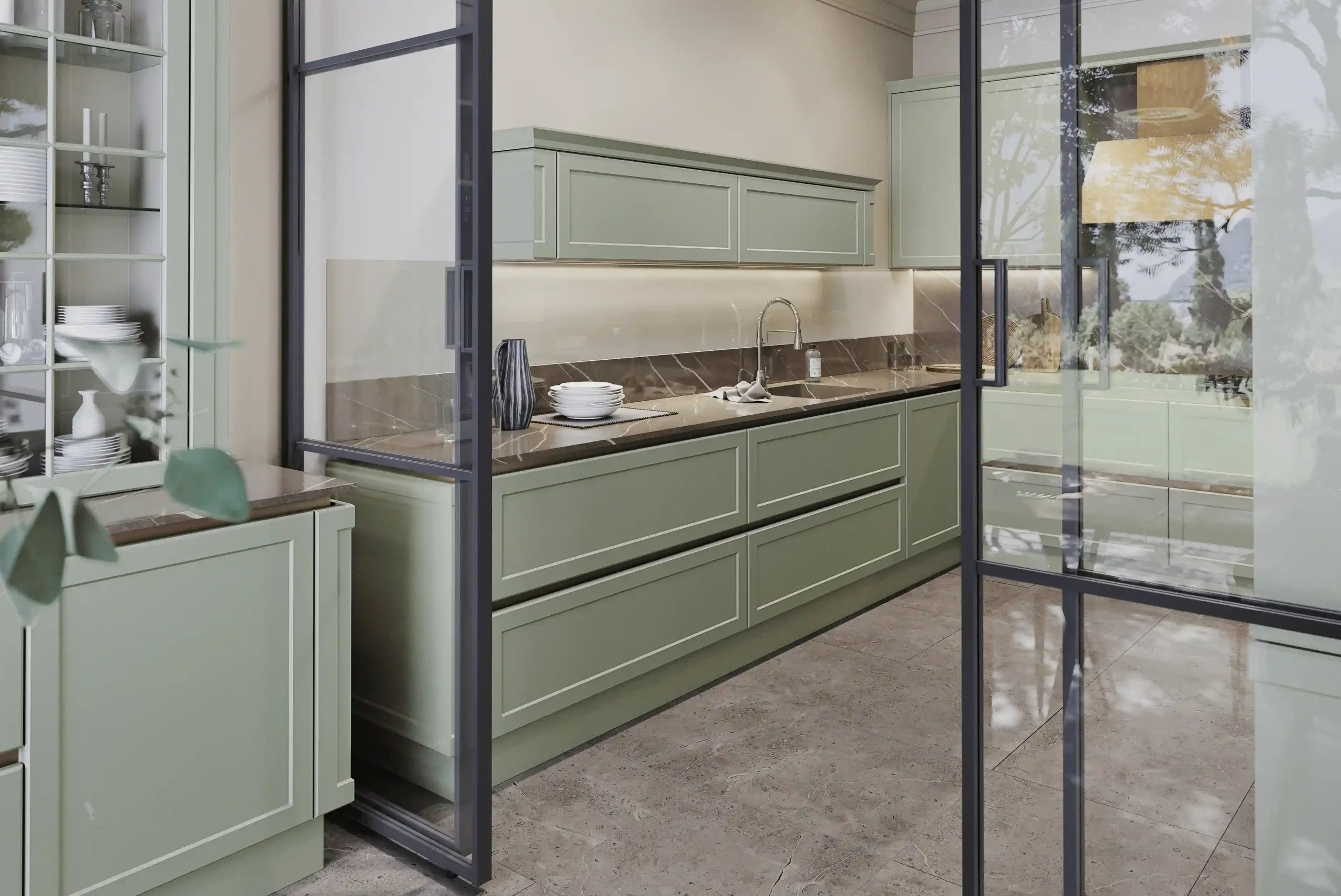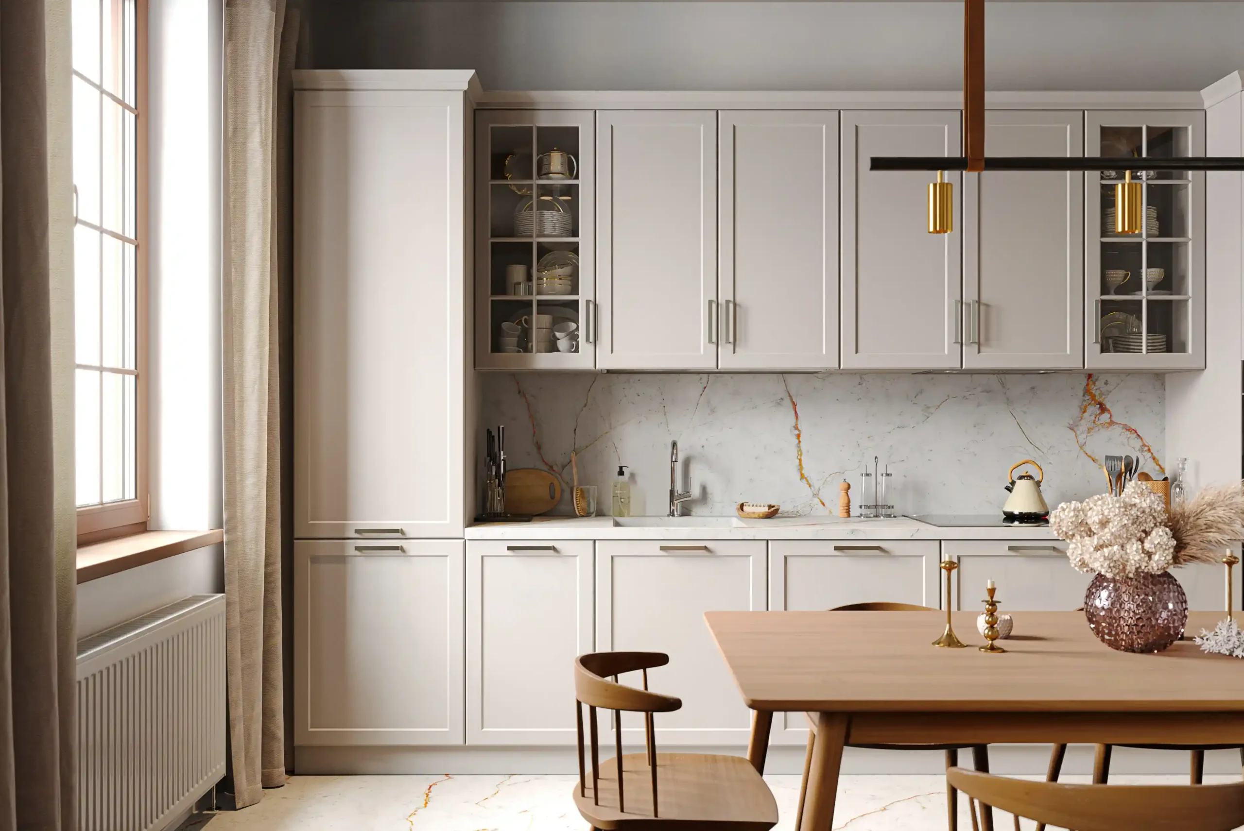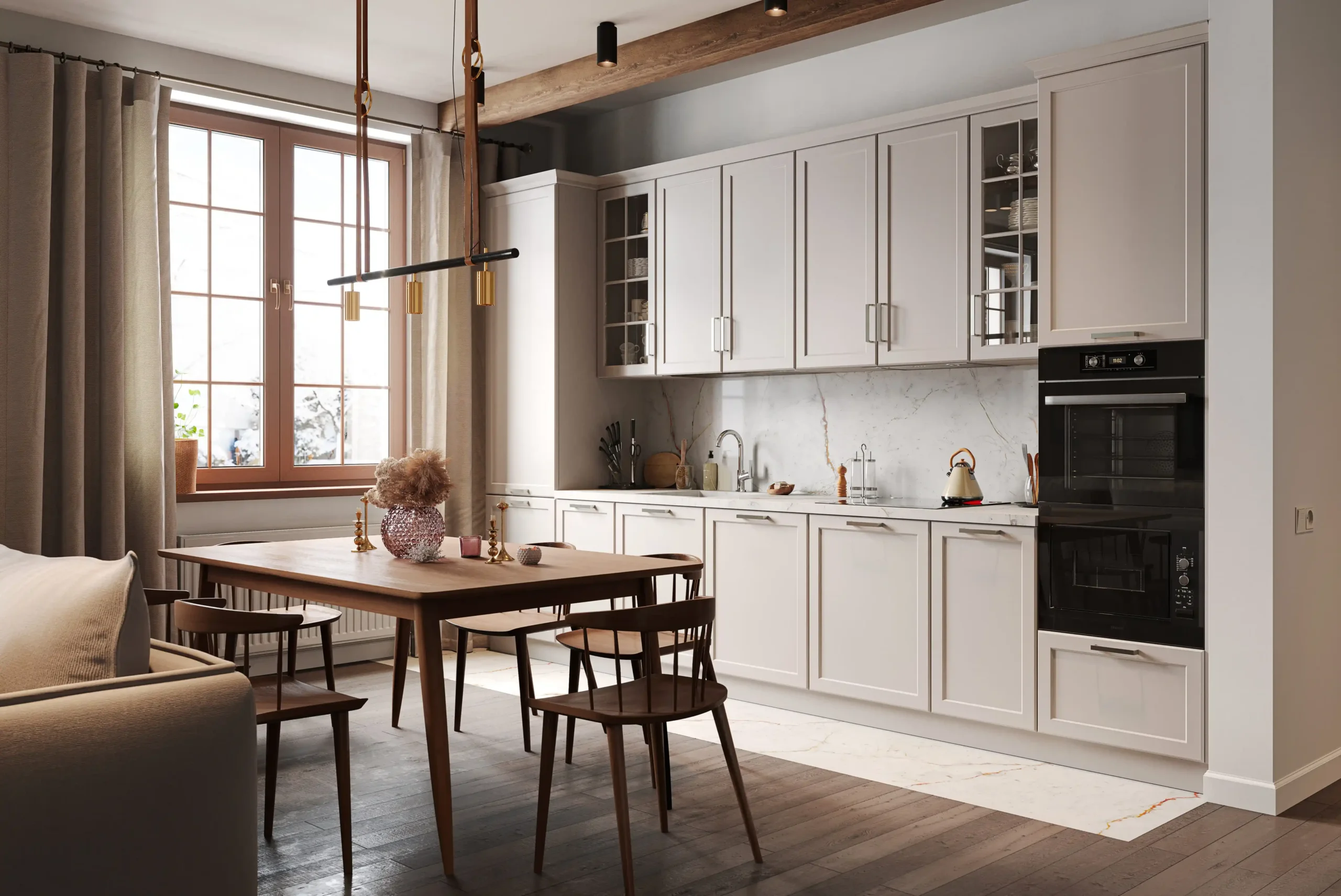 Модель Пикарди станет настоящим украшением для вашего дома: изящные рамочные фасады из крашеного МДФ и мягкие пастельные оттенки подчеркивают неоклассический стиль, в котором выполнена кухня. Данную модель можно заказать как с классическими накладными ручками, так и с Gola-профилем, оба варианта прекрасно сочетаются с общим дизайном кухни. Инновационные системы хранения и качественная фурнитура от известных производителей Blum и Firmax подчеркивают внимание к деталям. Откройте для себя мир безупречного дизайна и практичности вместе с кухней Пикарди !