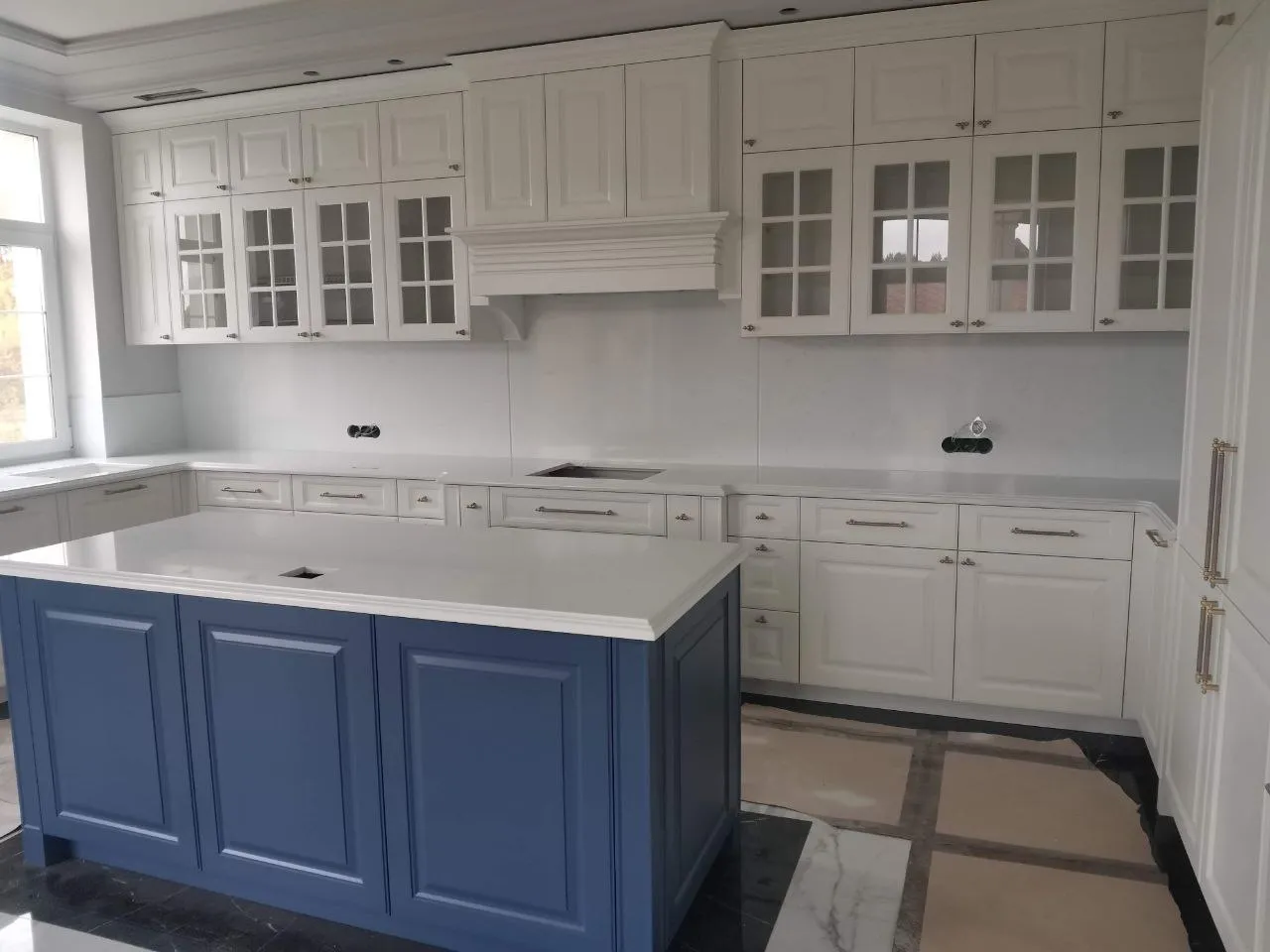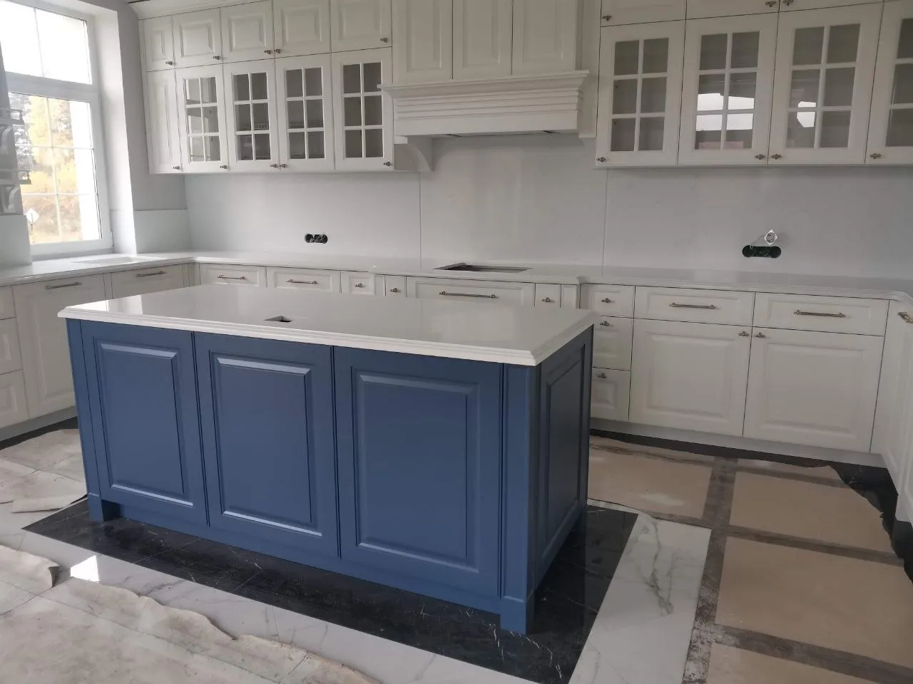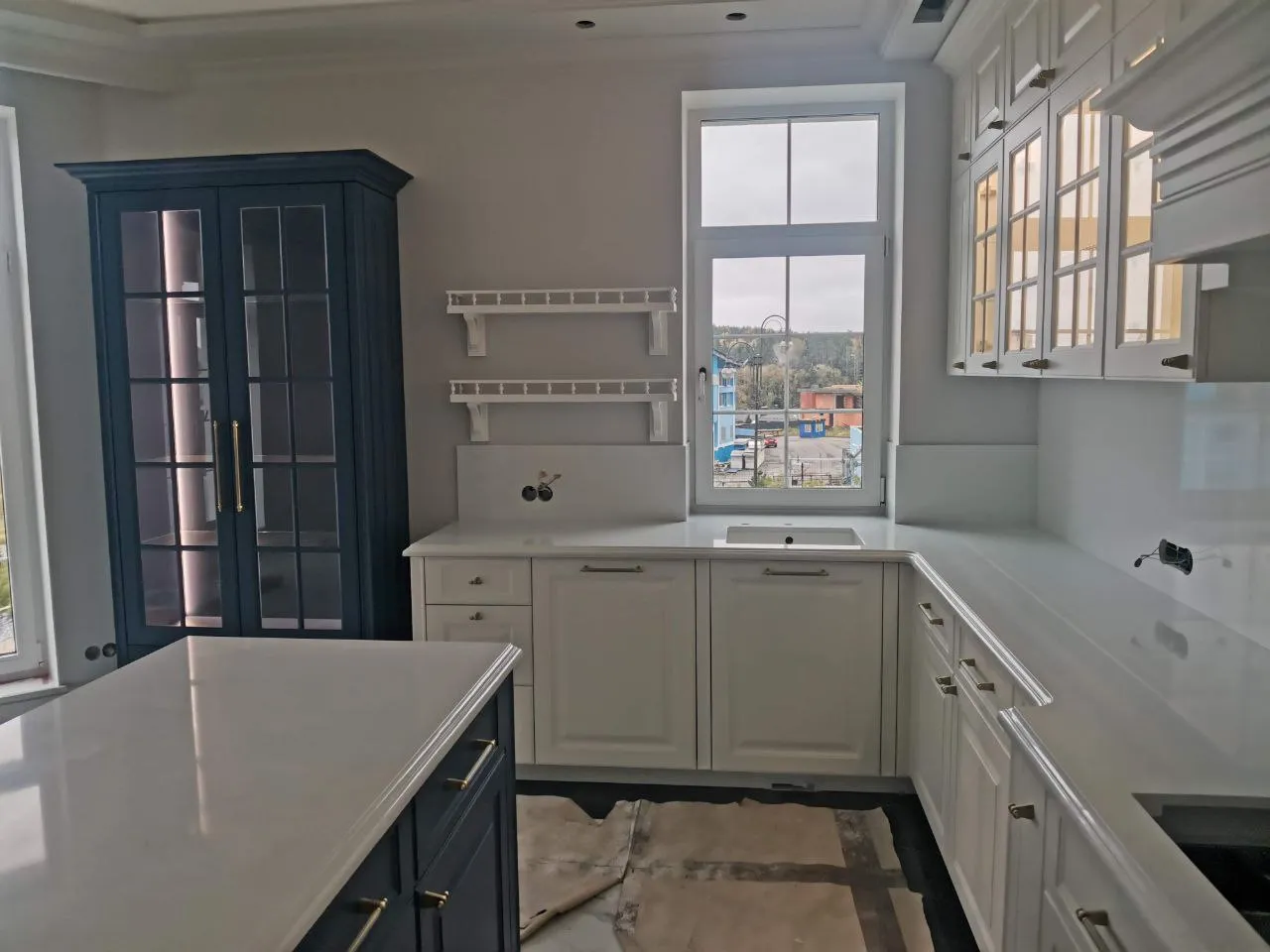 Столешницы кухни и острова, скинали – кварцевый агломерат Belenco Amalfi (Турция), толщина 20мм. Видимая толщина 40мм. Обработка торца – сложная фрезеровка, полировка. Вырез для мойки нижнего монтажа, вырез для варочной поверхности верхнего монтажа, отверстия для смесителя и дозатора моющих средств.