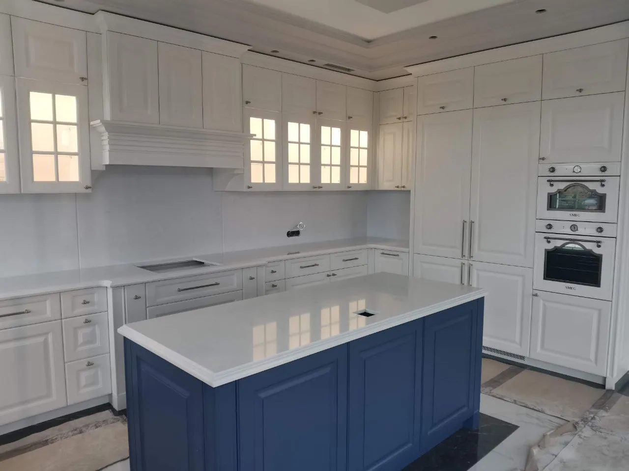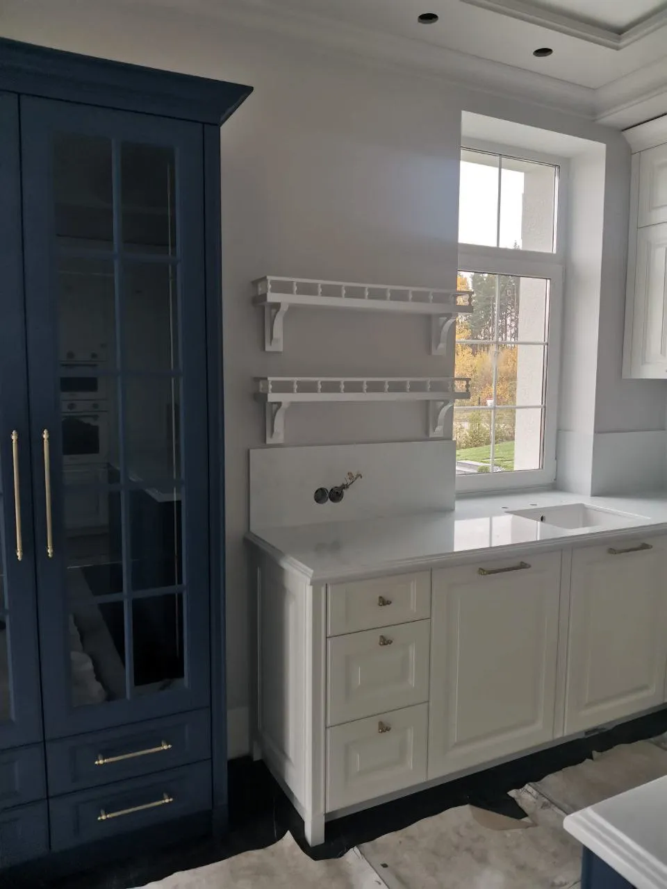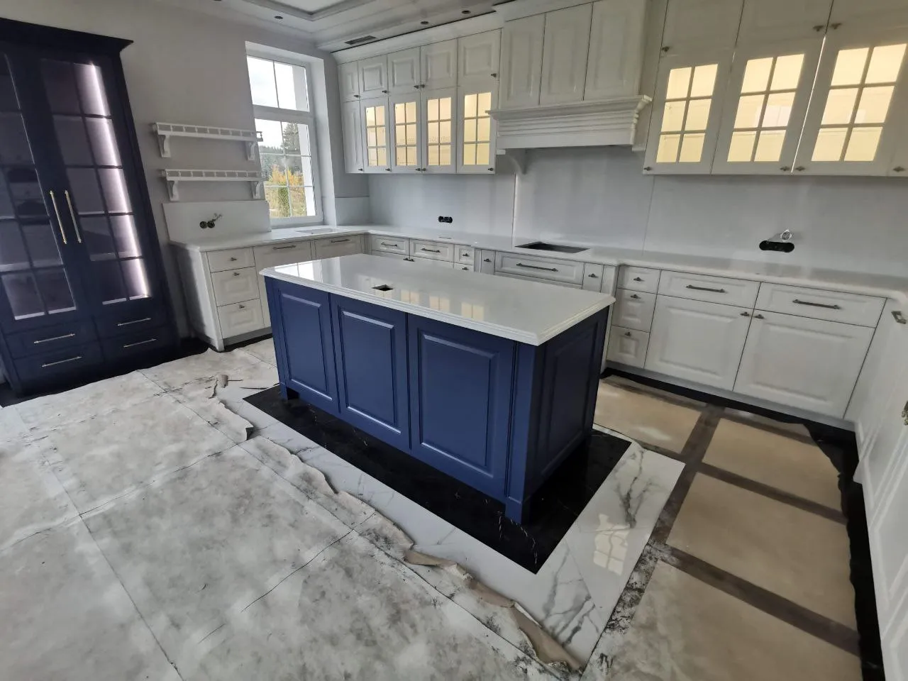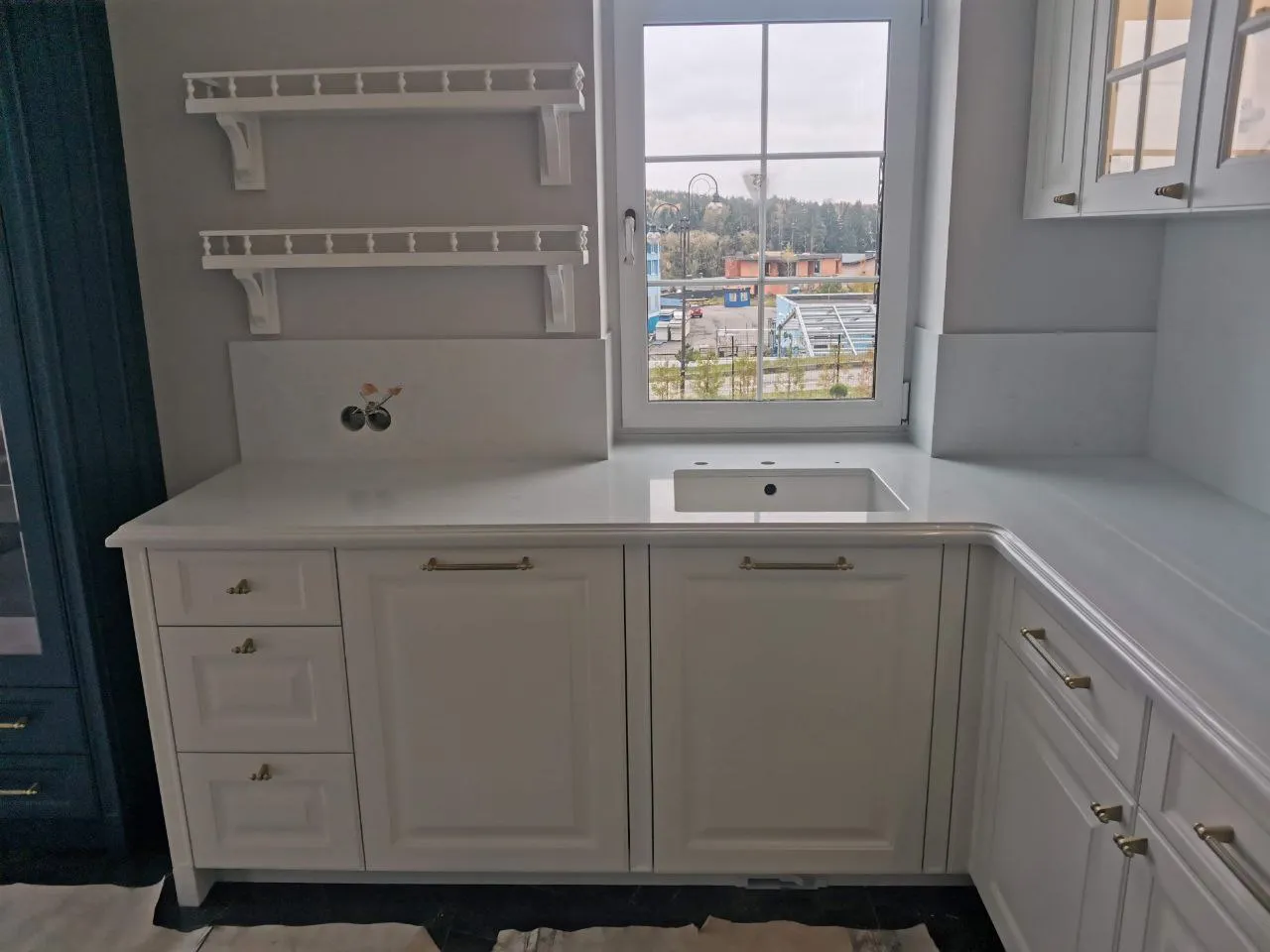 Столешницы кухни и острова, скинали – кварцевый агломерат Belenco Amalfi (Турция), толщина 20мм. Видимая толщина 40мм. Обработка торца – сложная фрезеровка, полировка. Вырез для мойки нижнего монтажа, вырез для варочной поверхности верхнего монтажа, отверстия для смесителя и дозатора моющих средств.